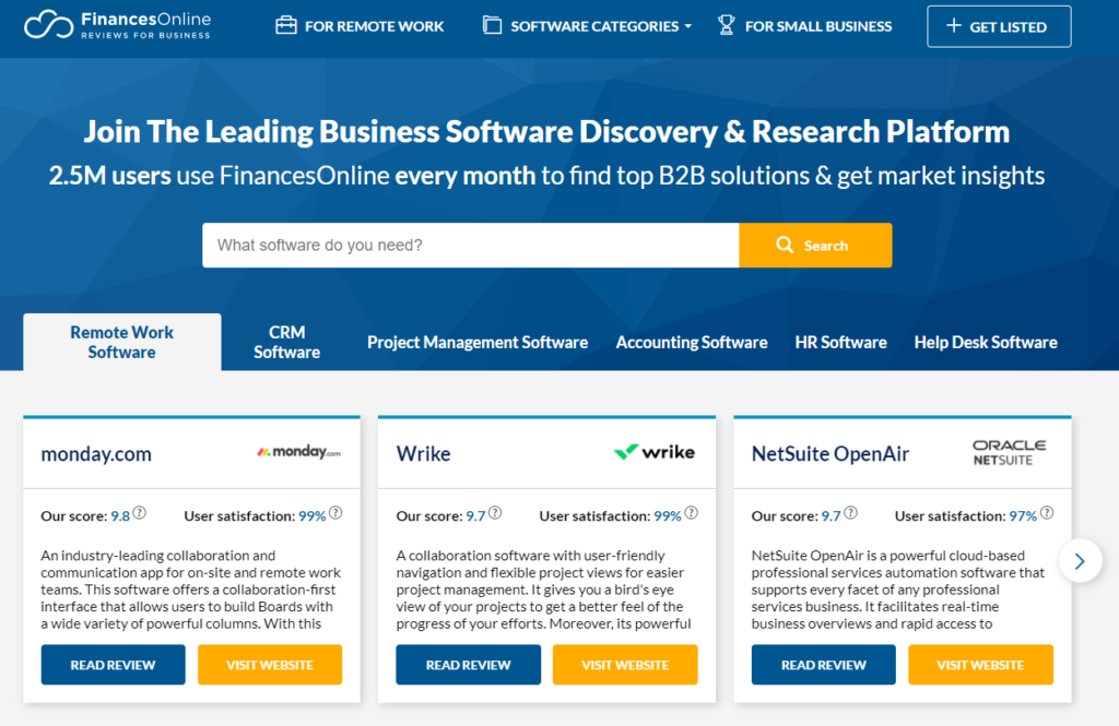 Kā tiešsaistes tirdzniecības vietas pārdevējs Capterra savieno pircējus ar tehnoloģiju ražotājiem programmatūras ražošanas nozarē. Uzņēmums palīdz miljoniem lietotāju atrast labākos programmatūras risinājumus. Piemērā varat redzēt, ka tas sniedz daudz vērtīgu detaļu, kā arī lietotāju atsauksmes.
