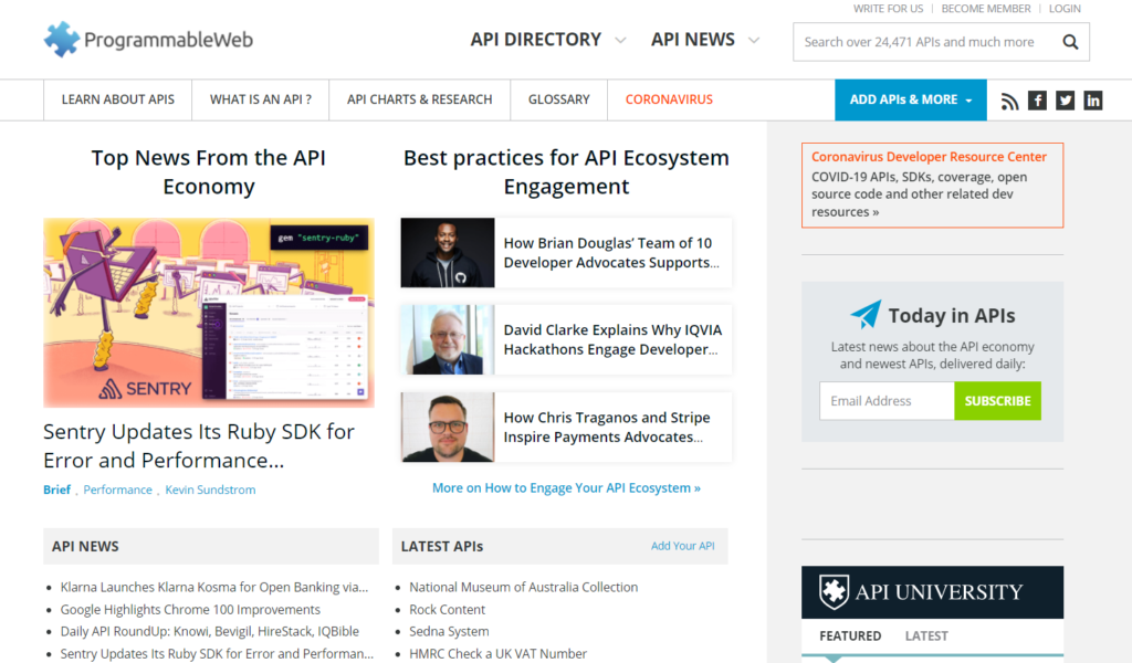 Vadošais API jaunumu un informācijas avots, kas seko šīs jomas attīstībai visā pasaulē un nodrošina tīmekļa API katalogu.