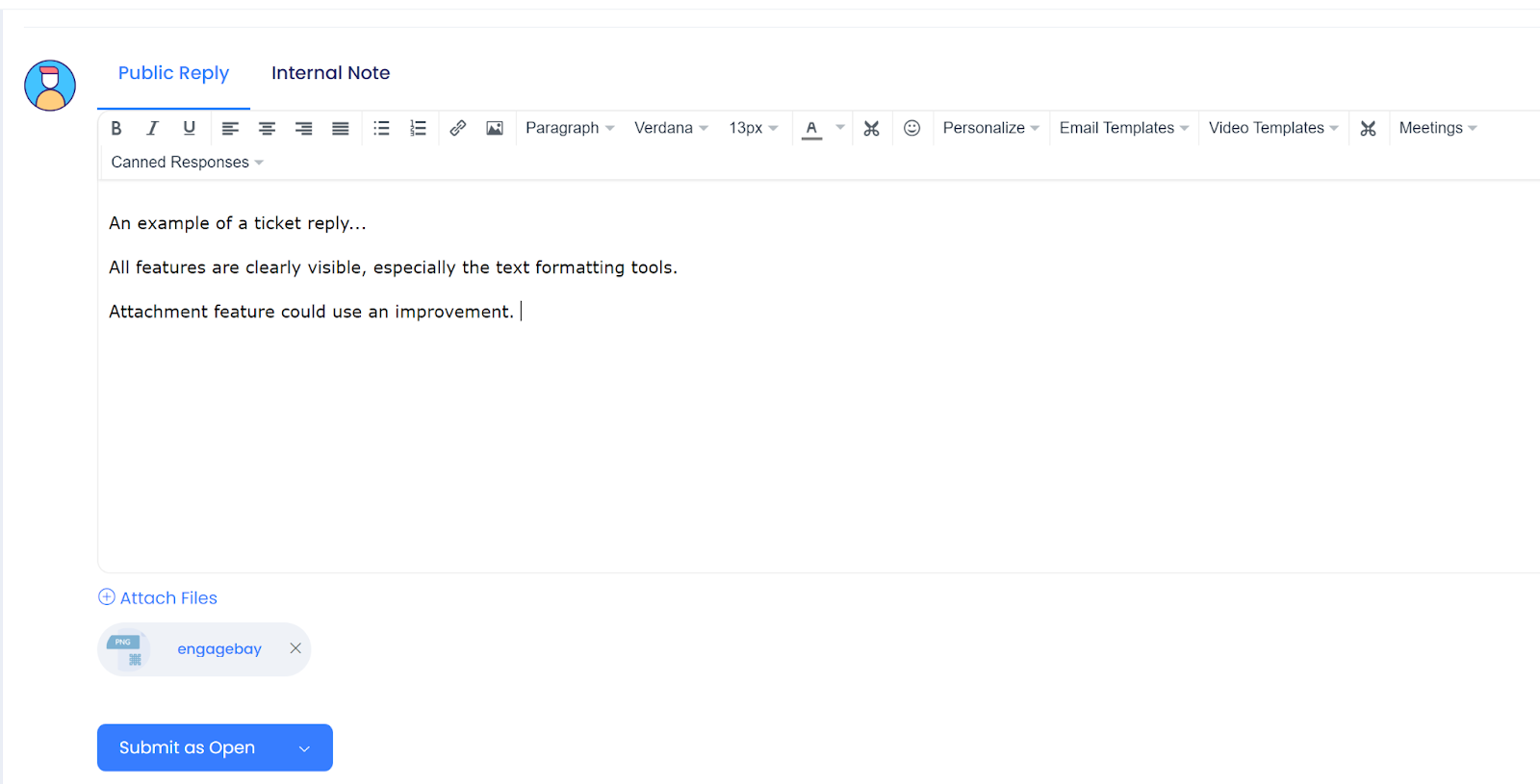 Dažu funkciju izmantošana var būt visai neveikla. Piemēram, jūs nevarat tieši kopēt un ielīmēt attēlus pieteikumos, jums jāizmanto pielikuma funkcija. Kaut kādu iemeslu dēļ tas neļauj automātiski pārlūkot pielikumus jūsu datorā, bet gan EngageBay lietotnē. Ja aizverat pieteikumu, nenosūtot savu ziņu, tā netiks saglabāta kā melnraksts. Jau atkal, tā nav liela problēma, taču droši vien nedaudz sarežģī lietas. Neskatoties uz to, EngageBay pieteikumu apstrādes rīks darbojas labi un jūsu darbplūsmai nevajadzētu ciest pat neskatieties uz dažām nelielām iebildēm.