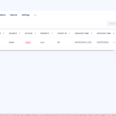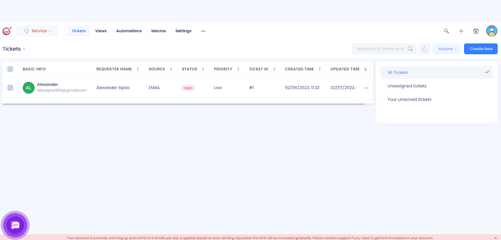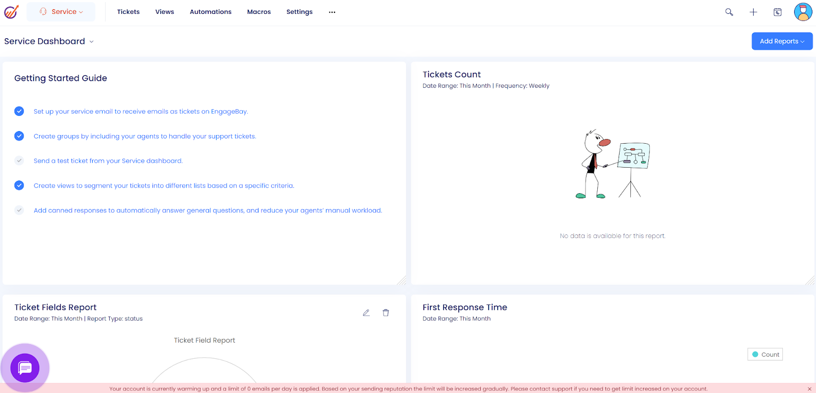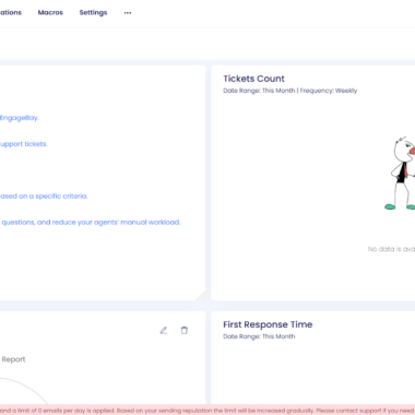 Lai gan EngageBay piedāvā daudz plašāku funkcionalitāti, mēs aplūkosim tikai ar pieteikumu apstrādi saistītās ServiceBay funkcijas. ServiceBay ir apkalpošanas un pieteikumu apstrādes funkciju komplekta nosaukums un piedāvā gluži standarta funkcionalitāti. Jūs varat piekļūt makro, SLA, pieteikumu apstrādes atskaitēm, automatizācijām, iepriekšsagatavotajām atbildēm, atbalsta grupām un pielāgotiem pieteikumu skatiem. Šīs funkcijas ir uzskaitītas oficiālajā EngageBay mājaslapā, tomēr pati pieteikumu apstrādes sistēma nodrošina plašāku funkciju klāstu. Tās varat atklāt, tiklīdz sākat pētīt tīmekļa lietotni.