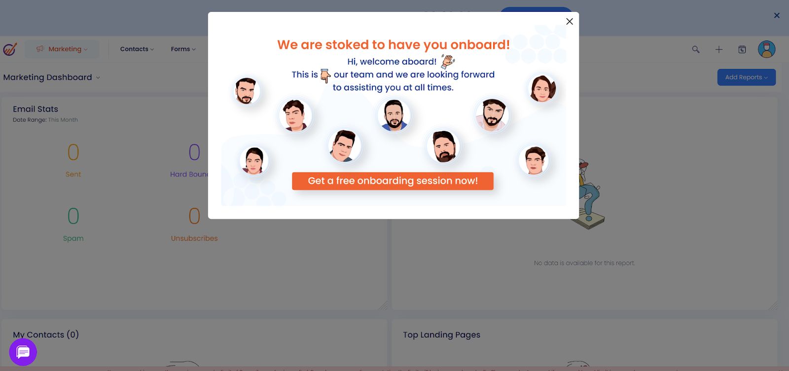 Engagebay ļauj uzsākt darbu bez maksas ar vienkāršu reģistrāciju, kas ir pieejama tieši viņu mājaslapā. Jums ir tikai jāsniedz pamatinformācija, kā arī jūsu tālruņa numurs un saite uz jūsu mājaslapu. Pēc tam, kad esat ieguvis piekļuvi jaunajai sistēmai, varat izvēlēties nekavējoties saņemt bezmaksas darba uzsākšanas sesiju.
