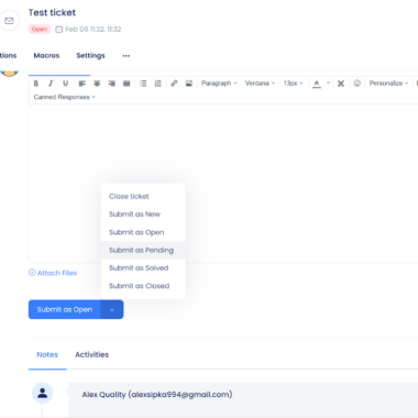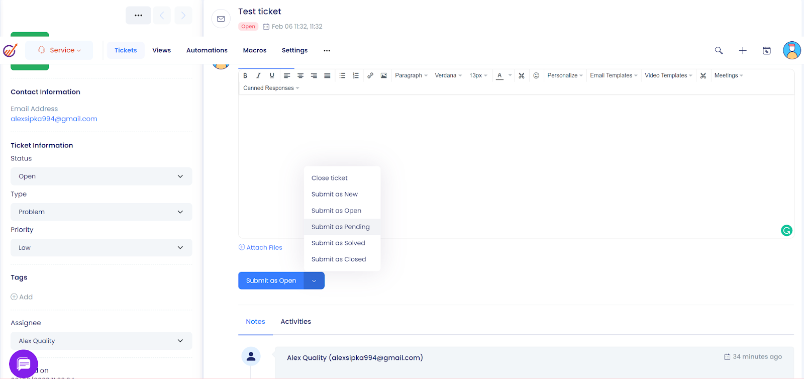 Pēc pieteikuma atvēršanas EngageBay atklāj vairāk funkciju, kas ne vienmēr ir minētas to cenu lapā. Tās ietver ļoti labi izstrādātu teksta redaktoru ar visām nepieciešamajām rediģēšanas un formatēšanas iespējām. Kreisajā panelī varat piekļūt arī iekšējām piezīmēm un izmantot informāciju par pieteikumu. Tajā ir iekļauti visi nepieciešamie lauki svarīgu datu par jebkuru atvērtu pieteikumu aizpildīšanai. Engagebay sūtīšanas poga kalpo arī statusa maiņai – varat izmantot aizvēršanas, gaidīšanas, atvēršanas, atrisināšanas un citas statusa iespējas.
