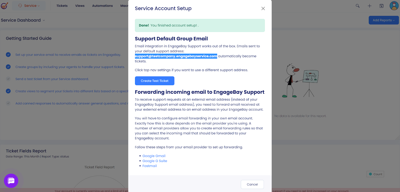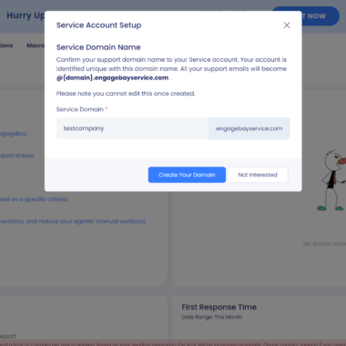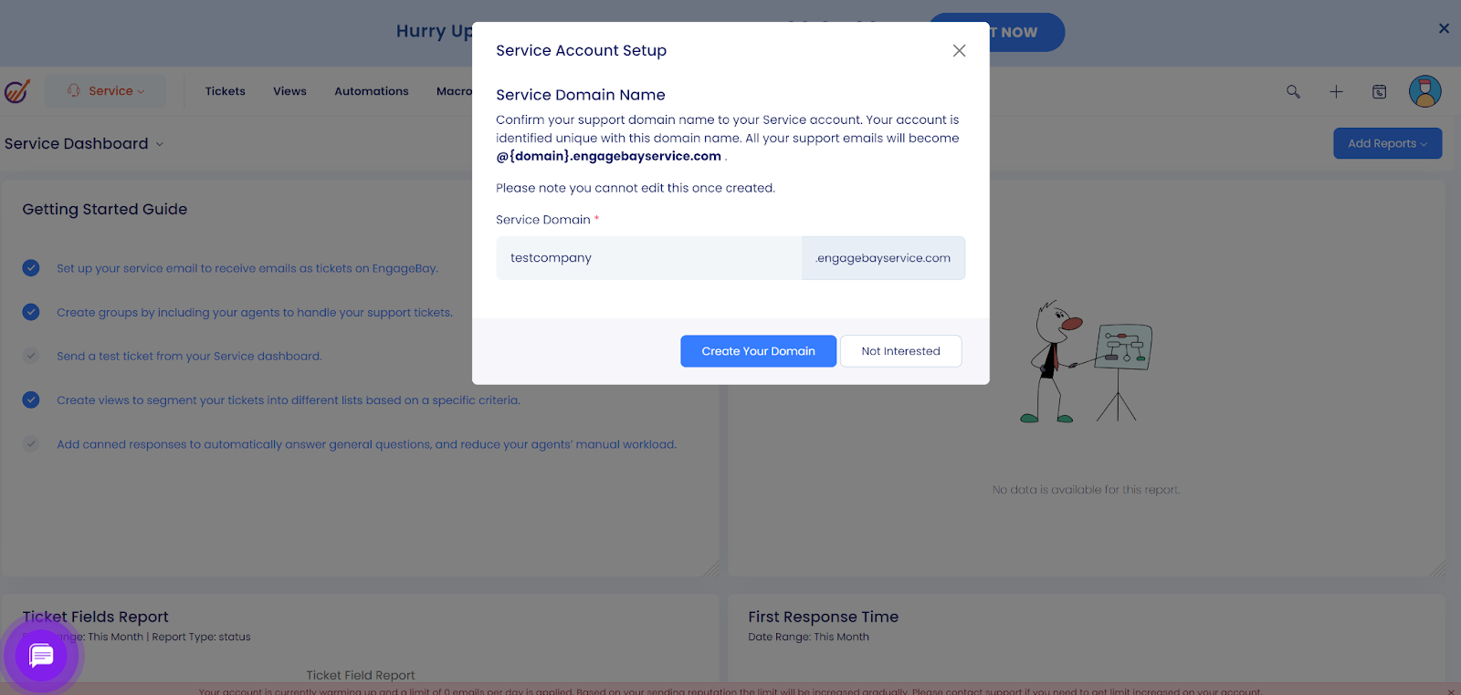 Lai piekļūtu EngageBay rīku kopas daļai Apkalpošana, varat noklikšķināt uz mārketinga pogas augšējā kreisajā stūrī un doties uz sadaļu Apkalpošana. EngageBay piedāvās izveidot specializētu klientu apkalpošanas domēnu pieteikumu saņemšanai. Pēc tam varat iepazīties ar EngageBay pieteikumu apstrādes saskarni.