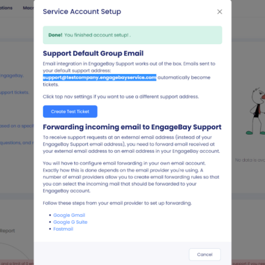 Ja vēlaties pārsūtīt savu e-pastu no cita e-pasta konta uz savu EngageBay pieteikumu apstrādes sistēmu, atveriet savu EngageBay Apkalpošanas informācijas paneli un atveriet Iestatījumi > Visi iestatījumi. Atrodiet Pārsūtīšanu pie POP/IMAP un noklikšķiniet uz Pievienot pārsūtīšanas adresi. Pēc tam vienkārši ievadiet vajadzīgo e-pasta adresi un noklikšķiniet uz “Tālāk”. Saglabājiet izmaiņas, un visam vajadzētu būt iestatītam.