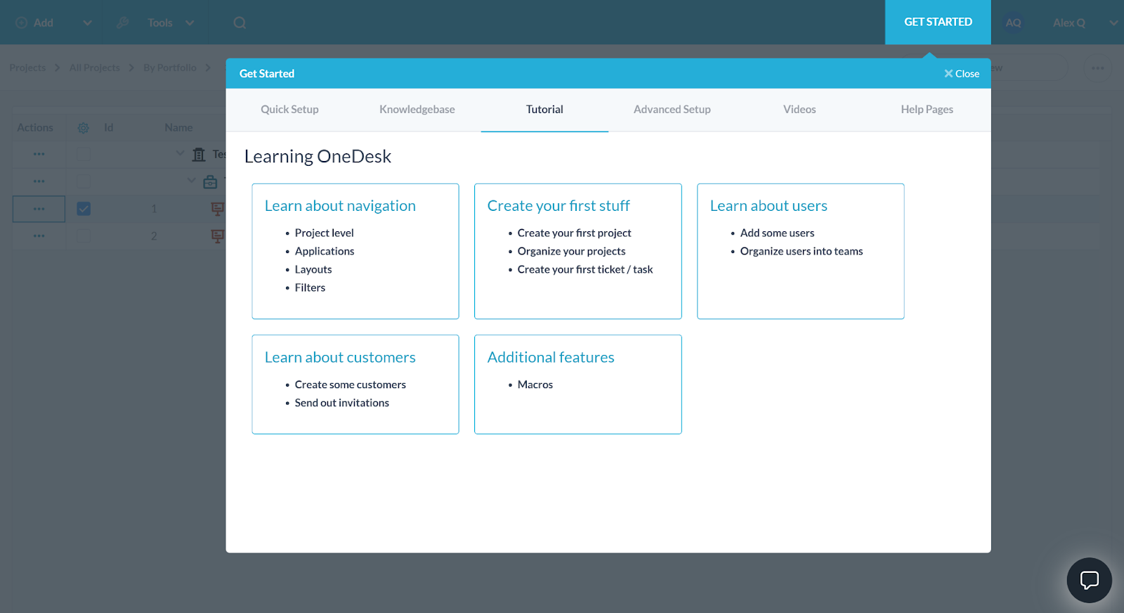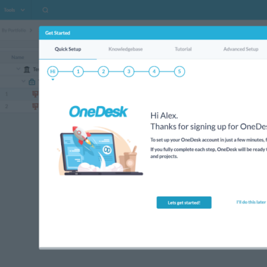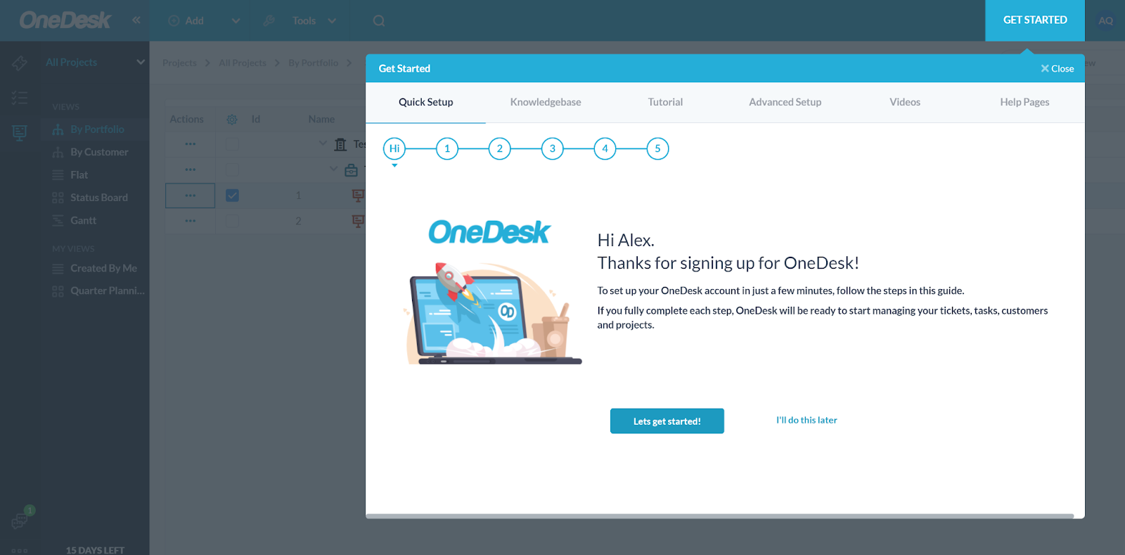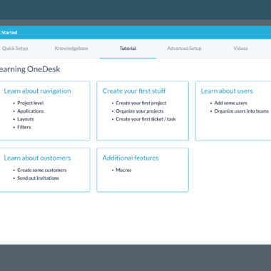 Iesaku neizlaist šo ceļvedi, jo tā varat parūpēties par dažām svarīgām lietām jau pašā sākumā. Varat iestatīt savu profila attēlu un parakstu, izveidot savienojumu ar atbalsta e-pastu programmā Outlook vai Gmail, izvēlēties alternatīvu e-pasta pāradresāciju, uzaicināt savus kolēģus un daudz ko citu. Vēl svarīgāk ir tas, ka varat iestatīt citas OneDesk funkcijas, piemēram, zināšanu pārvaldību, kā arī saņemt īsu apmācību, lai iegūtu pārskatu pār programmas darbu.