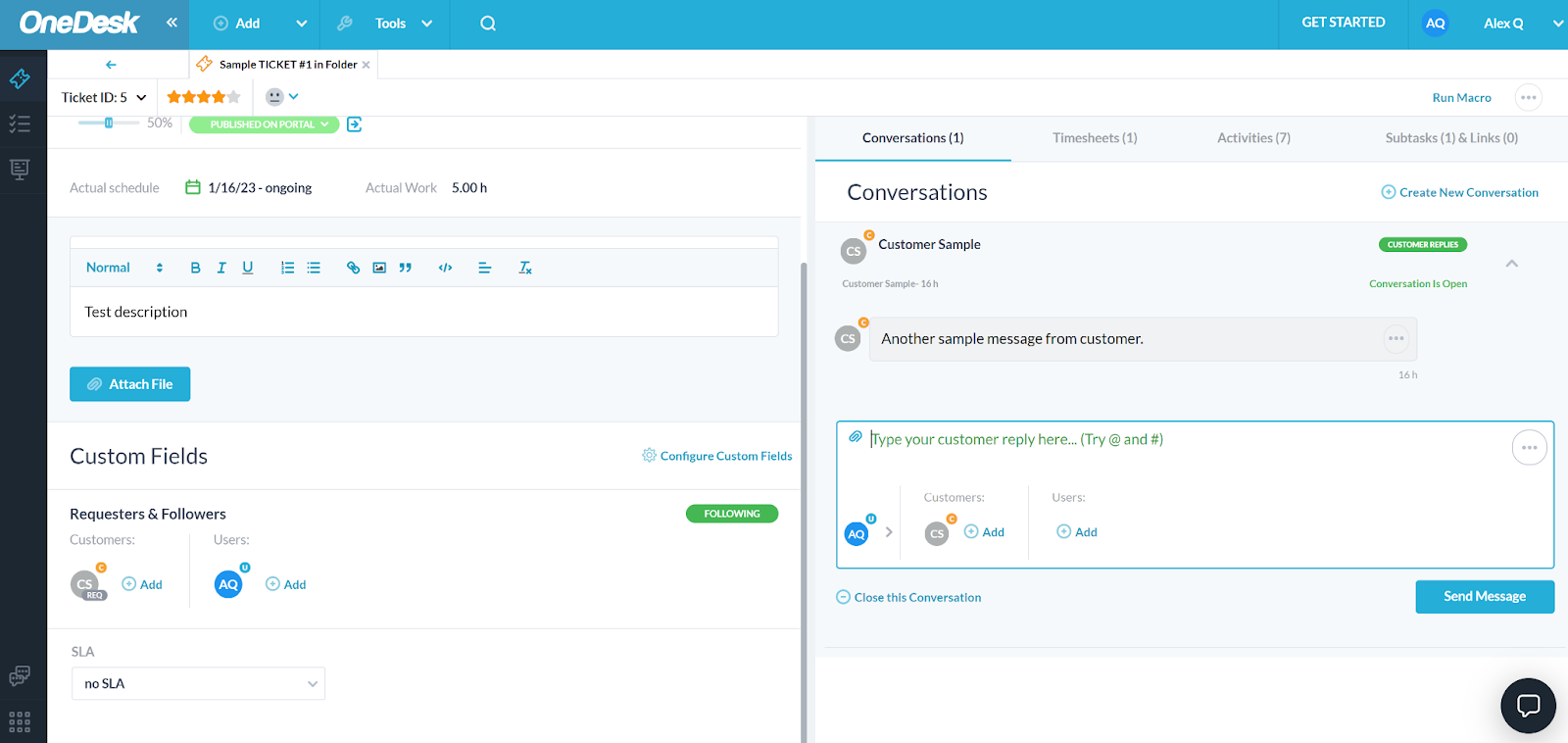 Es pats notestēju pieteikumu apstrādes rīku. Galvenais uzsvars ir galvenokārt uz aģenta pieredzi un lietošanas ērtumu. Es izmantoju savu e-pastu, lai sāktu sarunu ar sevi un izveidotu jaunu ienākošo pieteikumu OneDesk sistēmā. Kad e-pasts parādījās, es sāku atbildēt. Atvērta pieteikuma saskarne nav ļoti labi izstrādāta – tas ir diezgan mulsinošs un izskatās pārbāzts. Tas ir lietojams, bet nav tas labākais dizains vieglai navigācijai.