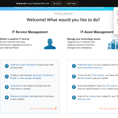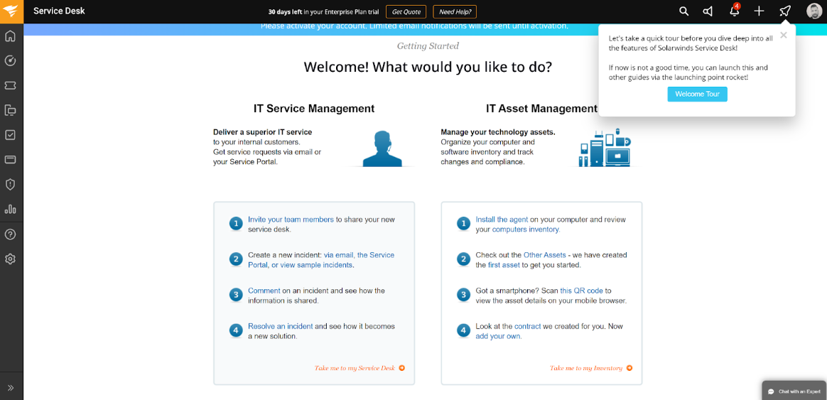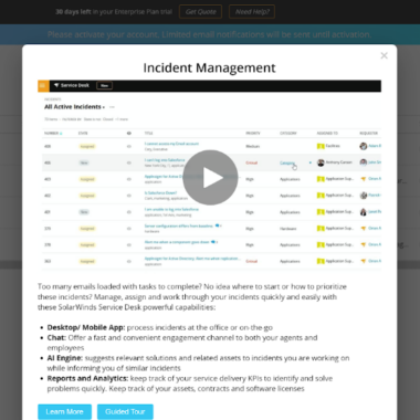 Tiklīdz noklikšķināsit uz “Aizved mani uz manu apkalpošanas paneli”, jūs aizvedīs uz incidentu pārvaldības informācijas paneli, kas ir pieteikumu apstrādes sistēma SolarWinds. Tīmekļa lietotne sniedz jums ātru piekļuvi incidentu pārvaldībai un piedāvā iespēju pilnībā apmeklēt vai noskatīties iepazīšanās video. Ja vēlaties izlaist šīs iespējas, vienkārši aizveriet logu un turpiniet darbu ar pieteikumu apstrādes sistēmu.