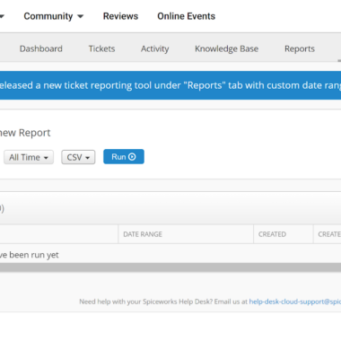 Spiceworks funkciju izsekošana nav viegls uzdevums, jo mājaslapa piedāvā tikai būtisko informāciju par viņu bezmaksas rīkiem. Tomēr, sākot izmantot lietojumprogrammu, jūs varēsiet iegūt labu pārskatu par Spiceworks pieteikumu apstrādes funkcijām. Pieteikumu apstrādes sistēmā jūs varat sagaidīt standarta palīdzības dienesta funkcionalitāti. Spiceworks var arī palīdzēt jums izveidot pašiem savu zināšanu bāzi un saņemt atskaites. Jūs varat izmantot arī eksporta funkcionalitāti, lai eksportētu atskaites datus trīs dažādos formātos.
