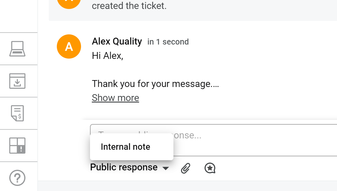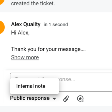 Atbildes lodziņš nav pārāk plašs, tāpēc viena no pirmajām lietām, par ko man bija interese, bija, vai tas izstiepjas. Tas tiešām izstiepjas rakstot, tomēr tas izstiepjas uz augšu, nevis uz leju. Tam ir maksimālais izmērs, un ja jūs rakstat garāku tekstu, jums būs jālieto ritināšana. Zem atbildes lauka varat piekļūt dažām rīkiem, piemēram, pielikumiem, iepriekšsagatavotajām atbildēm un iekšējām piezīmēm.