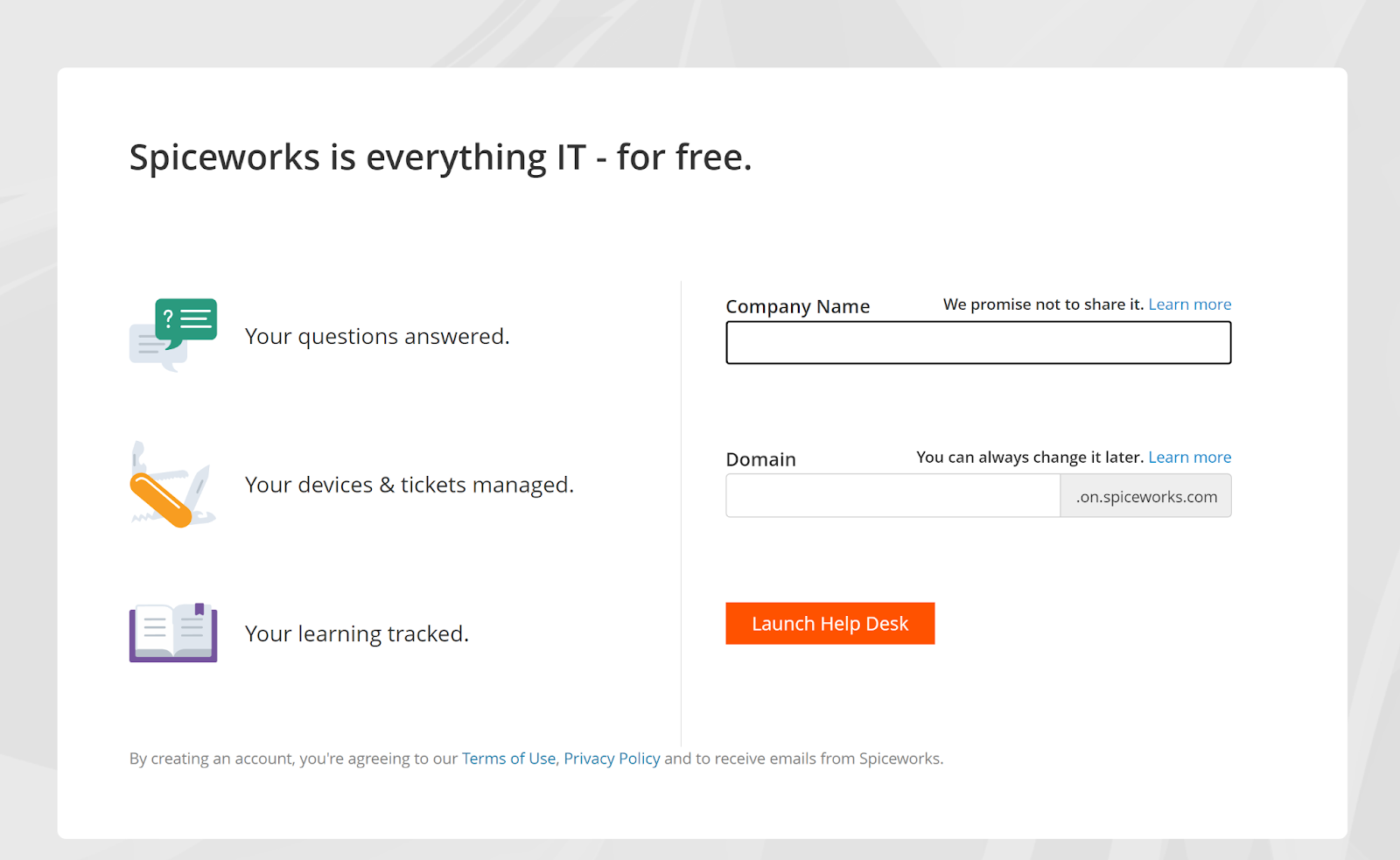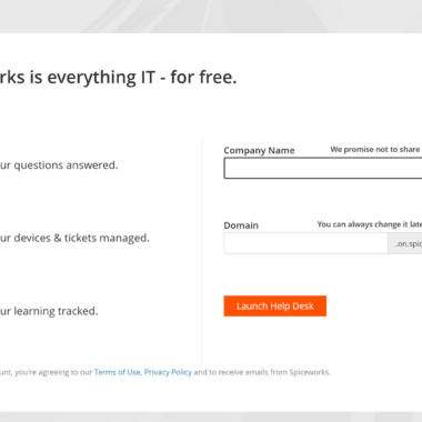 Spiceworks piedāvā savu IT palīdzības dienestu ar pieteikumu apstrādes sistēmu bez maksas. Spiceworks komanda pat iekļāvuši savā mājaslapā izklaidējošu sadaļu ar cenu paketēm. Tā uzskaita četras paketes ar līdzvērtīgām funkcijām un cenas zīmi $0. Tas nozīmē, ka jums tikai jāizveido savs konts Spiceworks mājaslapā un jāsāk darbs. Jums ir nepieciešama tikai pati pamatinformācija, kā piemēram, jūsu e-pasta adrese un vārds. Nākamajā solī varat izvēlēties jūsu palīdzības dienesta domēna nosaukumu.