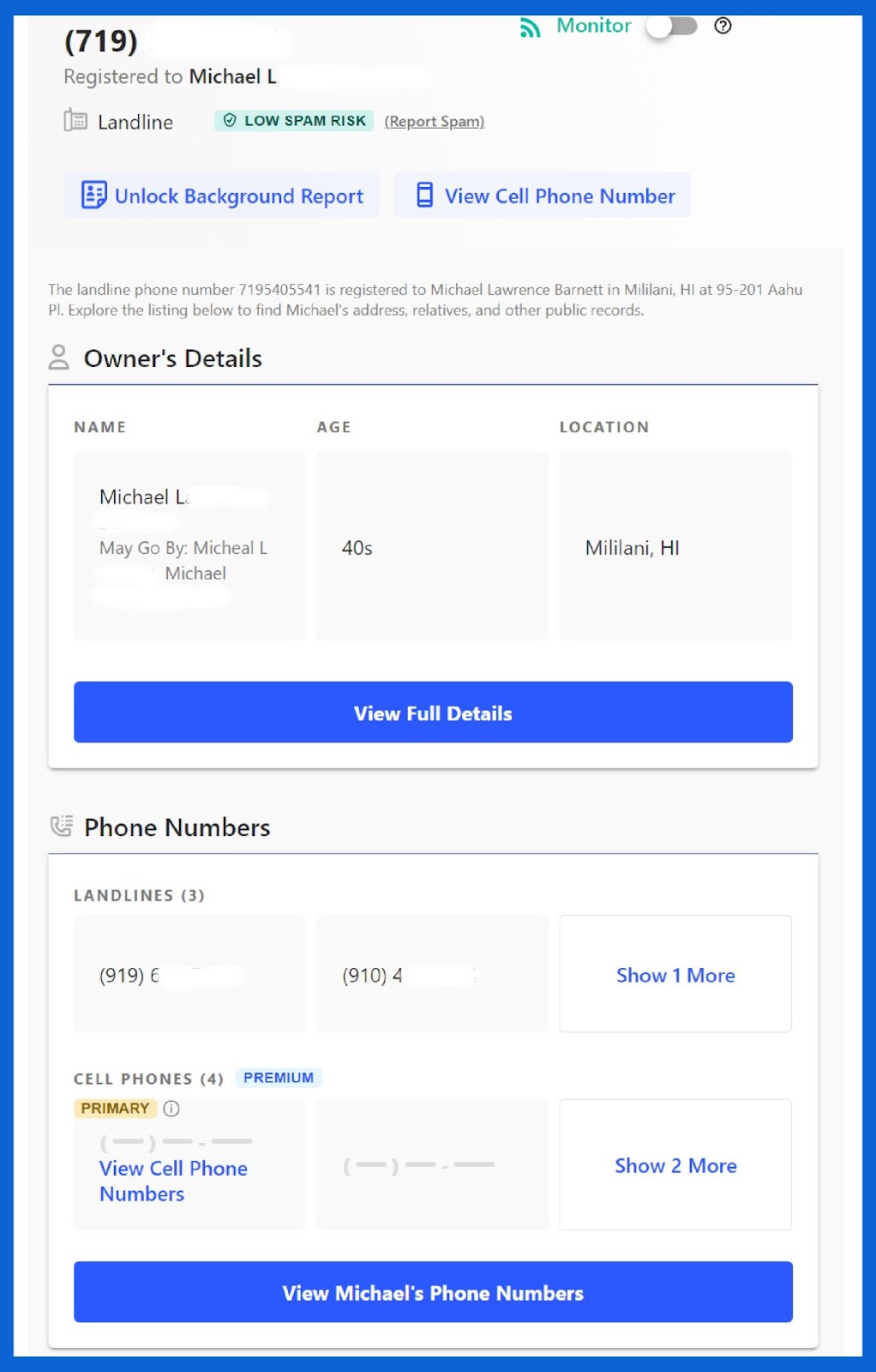 Dažos gadījumos mājaslapa/lietotne var sniegt detalizētākus rezultātus. Tādā gadījumā varat redzēt ar numuru saistīto vārdu un detaļas, piemēram, adresi, personas vecumu, citus tālruņa numurus, kas varētu būt saistīti ar to pašu personu, radiniekus un daudz ko citu. Tomēr, ja jums ir nepieciešama plašāka informācija par to sodāmību un informatīvos ziņojumus, tie ir pieejami pēc papildu maksas apmaksas.