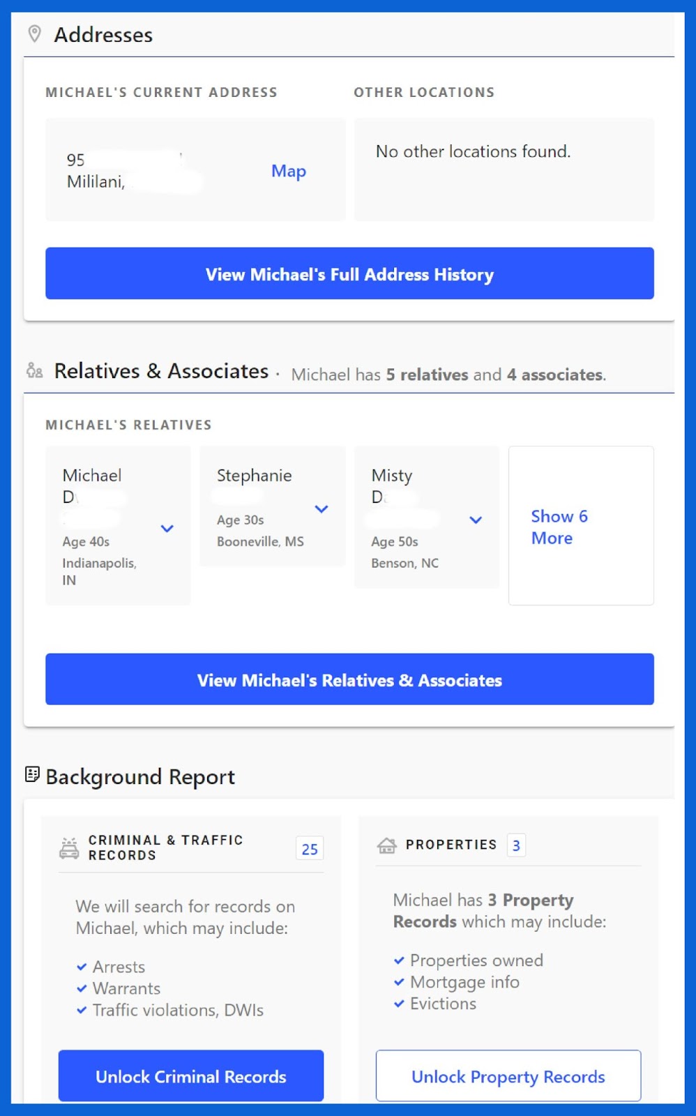 Piemēram, varat veikt personu meklēšanu bez maksas, kas ļauj ievadīt tās vārdu un uzvārdu meklēšanas joslā. Tas ātri vien atradīs numurus, adreses, radus un citus ar šovārdu saistītus publiskus ierakstus.