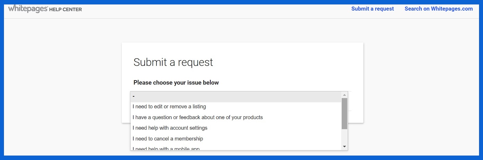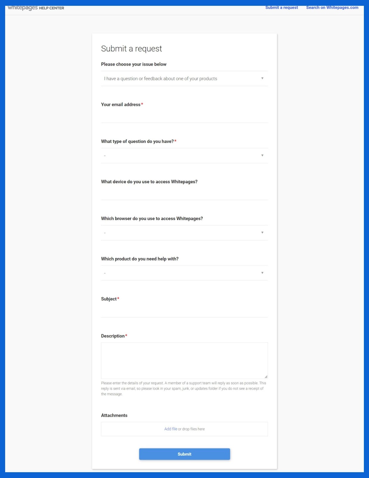 Varat sazināties ar Whitepages klientu atbalstu, aizpildot pieprasījuma formu viņu mājaslapā. Viņi nepiedāvā tiešsaistes čatu vai tūlītēju klientu atbalstu.