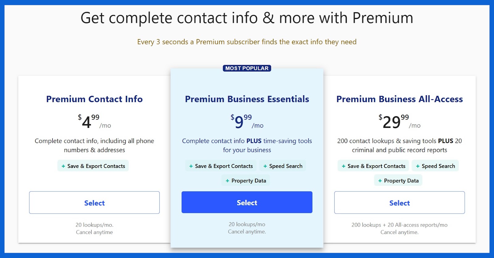 Par $4,99/mēnesī tas ir lētākais variants, ko viņi piedāvā. Šis abonements ietver pilnīgu kontaktinformāciju, kā arī visus tālruņu numurus un adreses. Varat arī saglabāt un eksportēt kontaktpersonas. Taču tas ir ierobežots ar 20 meklēšanas reizēm mēnesī. Izvēloties šo iespēju, jūs varat izvēlēties divus norēķinu ciklus. Varat maksāt $4,99/mēnesī vai samaksāt avansā uzreiz par 12 mēnešiem, kas maksā $29,99, un tas ir $2,50 mēnesī.