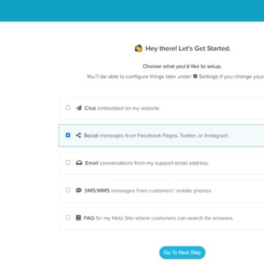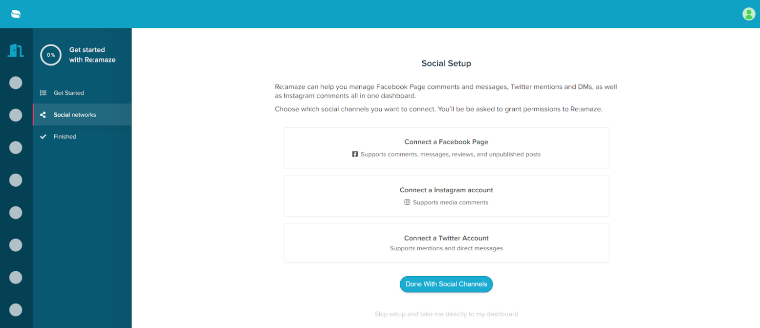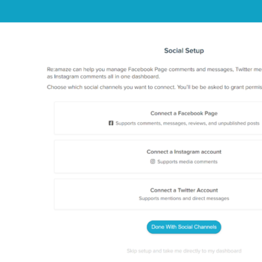 Re:amaze ļauj sākt darbu ar bezmaksas izmēģinājumu, tāpēc jums uzreiz nav jāizvēlas pakete. Pēc jūsu informācijas ievadīšanas reģistrācijas formā Re:amaze palīdzēs iestatīt visu nepieciešamo. Tas man sniedza iespēju iestatīt čatu, e-pastu, SMS/MMS, BUJ vai sociālos medijus. Es izvēlējos sociālo mediju iespēju, jo tieši uz to mēs koncentrēsimies šajā apskatā. Pastāv arī iespēja pilnībā izlaist šo uzstādīšanas daļu.