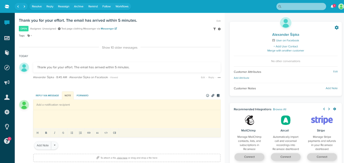 Darbs ar Re:amaze sākumā šķiet kā mikslis. Tā ir lieliska izskata sistēma, kas, šķiet, visu dara nevainojami. Pirmā problēma, ko pamanīju, ir tā, ka nesaņēmu paziņojumu par ienākušu Messenger ziņu. Man bija jāatsvaidzina sistēma un manuāli jāmeklē paziņojumi iesūtnē. Tiklīdz es to atradu, viss atkal kļuva labāk, izmantojot pieteikuma iekšējo saskarni. Vēlāk es uzzināju, ka paziņojumi ir jāaktivizē manuāli, kas šķiet dīvaina izvēle. Manuprāt, šai funkcionalitātei būtu jābūt aktīvai jau no paša sākuma.