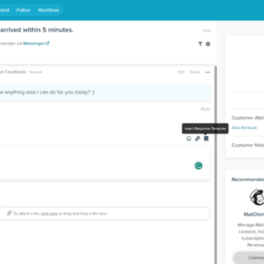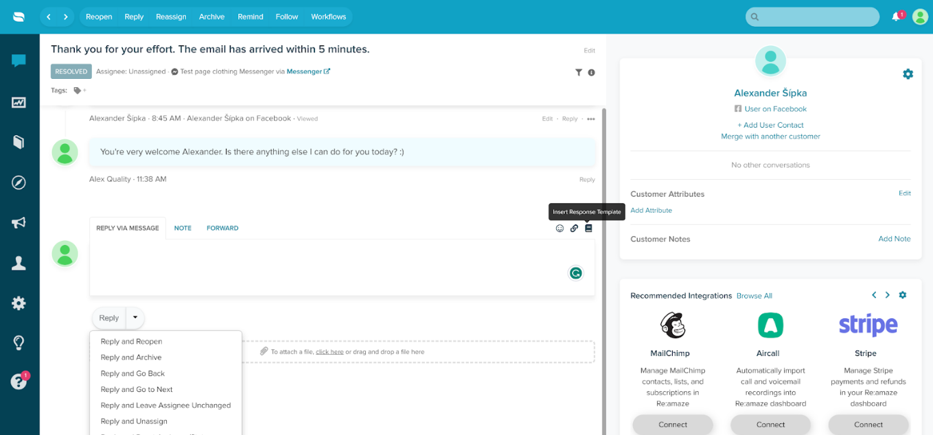 Atbildēšanas pieredze ir diezgan patīkama. Es varēju noklikšķināt, lai pievienotu failus un pielikumus, vai arī vilkt un nomest tos tieši uz ziņas. Man bija arī iespēja ievietot atbildes sagataves, emocijikonas un izvēlēties statusa maiņu, kas tiks izmantota, atbildot uz ziņu. Tas nav bagātākais funkciju kopums, ko jebkad esmu redzējis sociālo mediju klientu apkalpošanas pieteikumu apstrādes sistēmā, taču tas nodrošina visu nepieciešamo, lai efektīvi sazinātos.