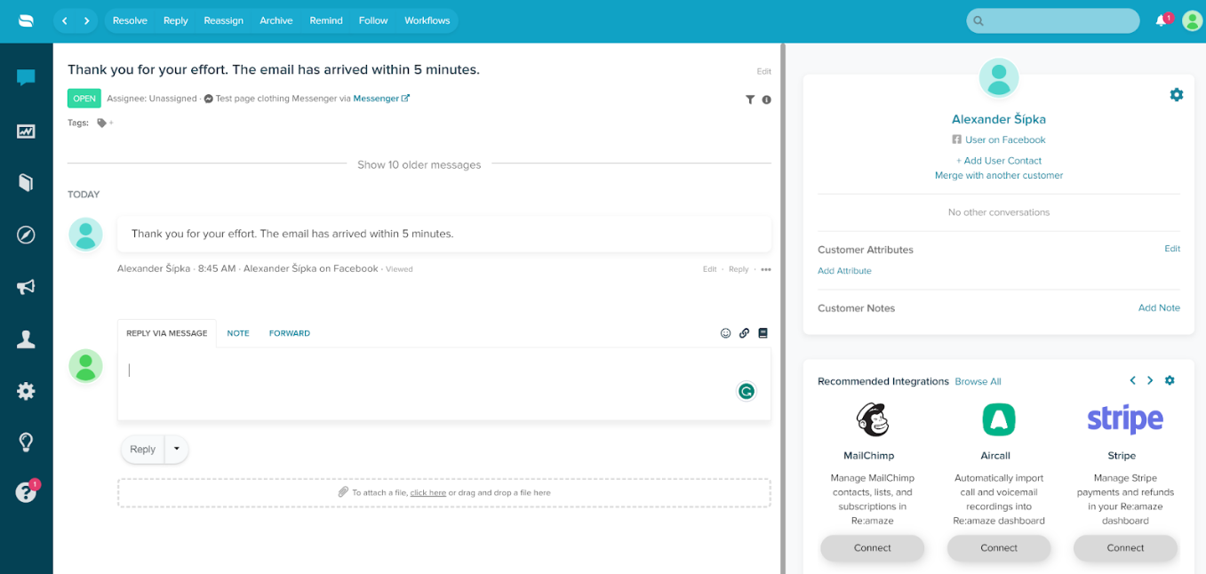 Pieteikumu funkcionalitāte paliek nemainīga, neatkarīgi no tā, vai tie ir no Facebook, Instagram vai Twitter. Tas, no vienas puses, ir labi, jo novērš jebkādu atbildēšanas apjukumu un ļauj ērti strādāt vienotā darbplūsmā izmantojot ikvienu sociālo mediju pieteikumu neatkarīgi no tā avota. No otras puses, šķiet, ka Re:amaze piemirsuši, ka katrs sociālo mediju tīkls piedāvā atšķirīgu funkciju kopumu, kas varētu labi darboties, ja tiktu izmantots Re:amaze sociālo mediju pieteikumu apstrādes sistēmā.