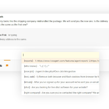 Vēl viena noderīga funkcija ir iepriekš iestatītās iepriekšsagatavotās ziņas. Čatojot ar mājaslapas apmeklētāju, LiveAgent piedāvā plašu iepriekšsagatvoto ziņu izlasi un pat ļauj rakstīt savas. Meklēšanas josla ļauj aģentiem arī pārlūkot iepriekšsagatavotās atbildes gadījumam, ja esat iestatījis vairākas un nav laika ritināšanai.