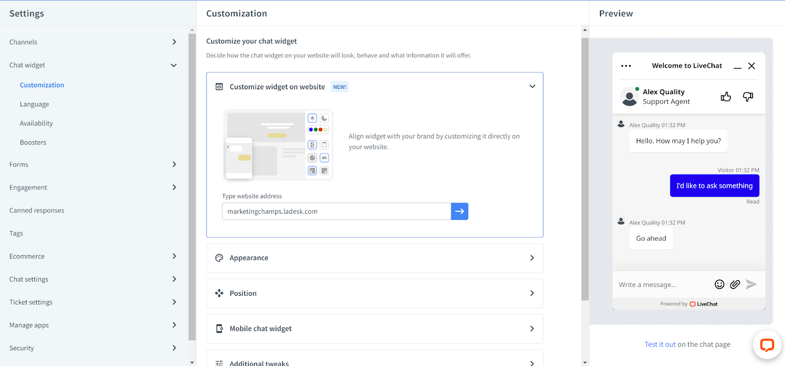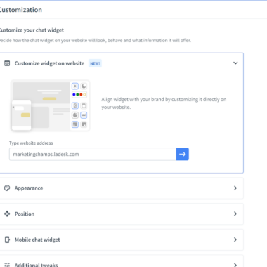 Čata logrīku varat pielāgot LiveChat iestatījumos. Iespējas ir diezgan plašas, tāpēc, ja jums šķiet, ka esat gana radošs, varat pielāgot tiešsaistes logrīku savām vēlmēm vai klienta zīmolam. Jūsu izvēle attiecas uz to, kā logs izskatīsies maksimizētā un minimizētā skatā, gaišu vai tumšu dizainu, dizaina krāsu (pieejama pielāgota krāsa) un čata atrašanās vietu. Pastāv arī iespēja paslēpt logrīku, pielāgot čata logrīka mobilo versiju un papildu uzlabojumi, kur varat parādīt sava uzņēmuma logotipu, aģenta fotogrāfiju, iespējot vai atspējot skaņas, atļaut čata vērtējumus un vēl vairākas citas iespējas.