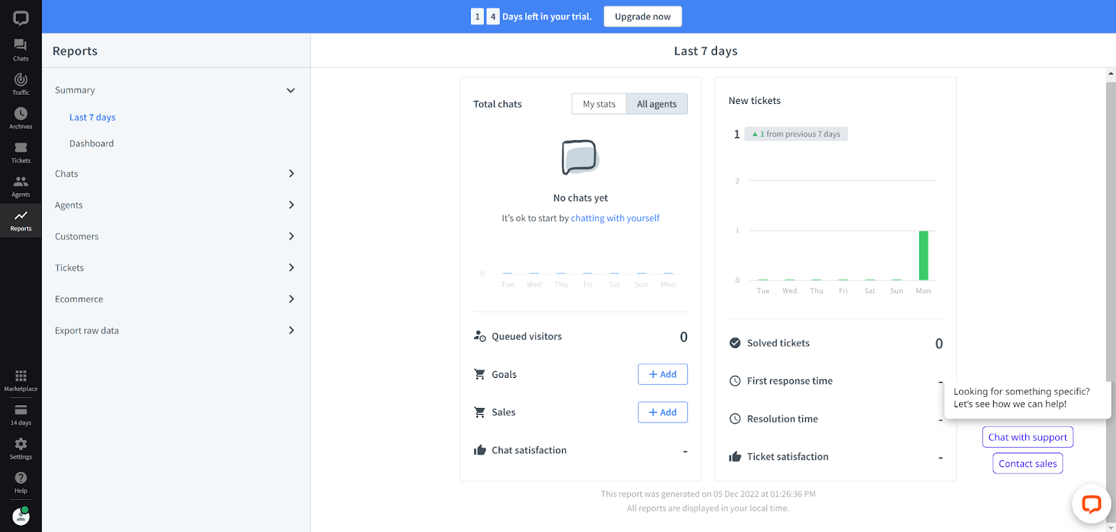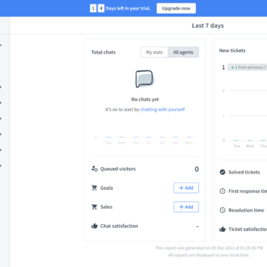 Analīzes līdzekļi piedāvā ātru pārskatu, kā arī padziļinātus pārskatus par visu, kas saistīts ar tiešsaistes čatu – čatiem, aģentiem, klientiem, pieteikumiem un e-komerciju. Katra sadaļa var sniegt jums papildus informāciju un konkrētus skaitļus par jūsu tiešsaistes čatu. Nekas nepietrūkst. Analīzes pārskats sniedz informāciju par visu, kas noticis jūsu lietošanas pēdējo septiņu dienu laikā.