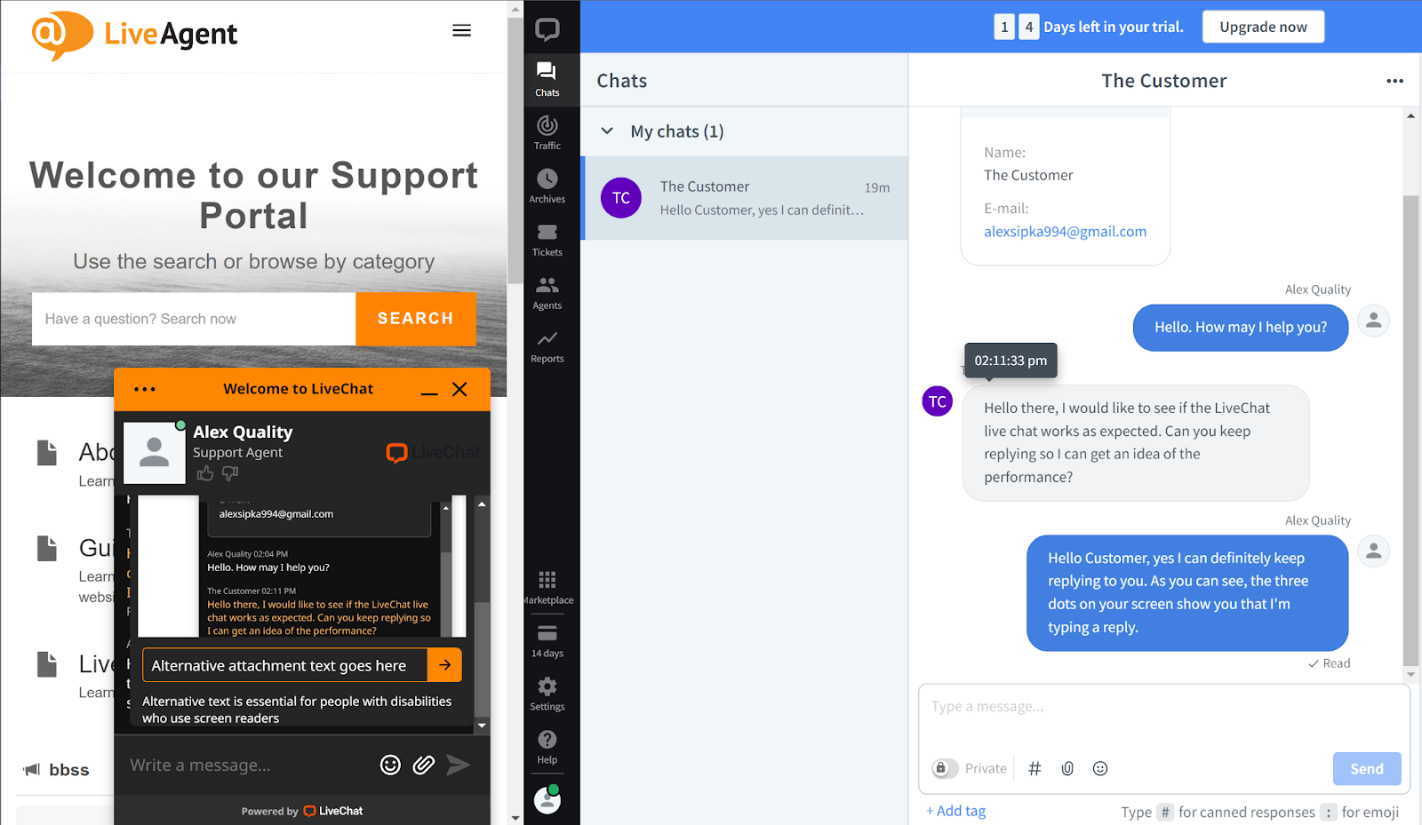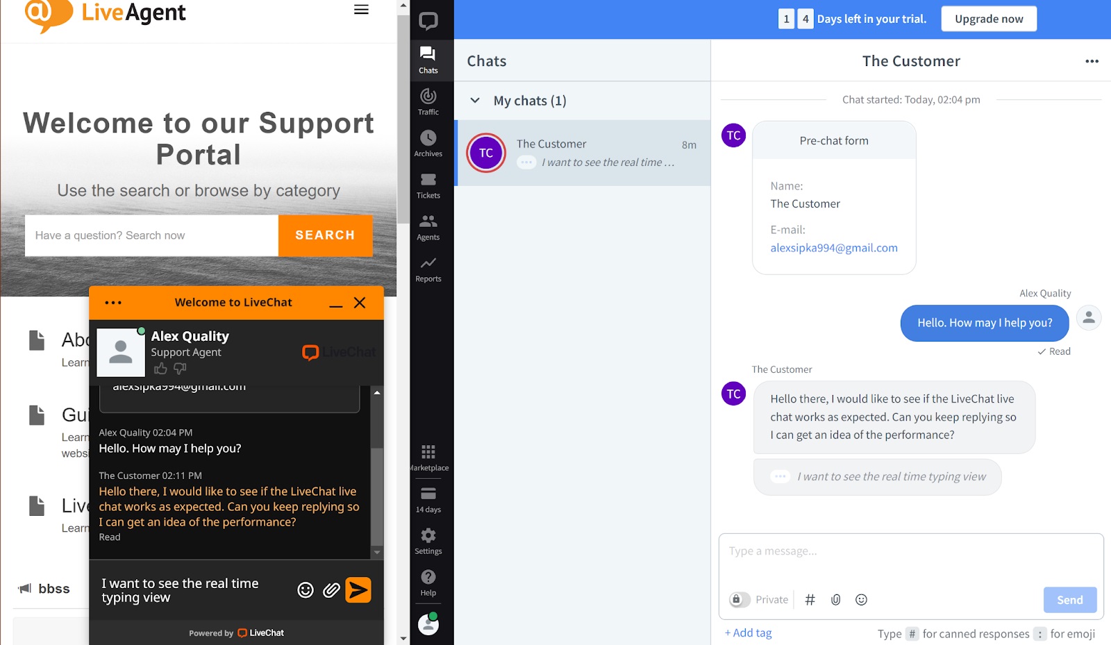 Ieskats ziņas rakstīšanas laikā darbojās nevainojami, un tas parādīja to, ko es rakstu mazāk kā sekundes laikā. Ziņa paliek uz ekrāna, līdzkamēr lietotāji nenospiež nosūtīšanas pogu, lai jūs varētu tikmēr gatavot pārējās ziņas. Tai pat laikā klients redz trīs punktus kā informāciju, ka aģents raksta atbildi uz tiem. Kopumā tas darbojas ļoti labi. Atbildes ātrums ir gandrīz tūlītējs, bez ilgiem gaidīšanas laikiem.