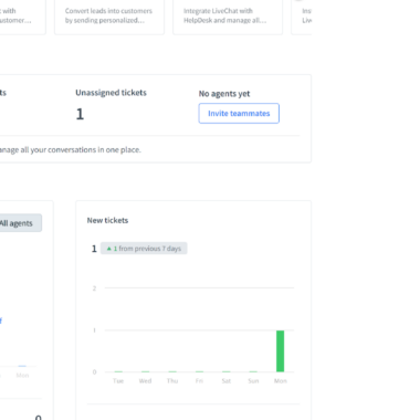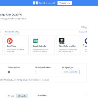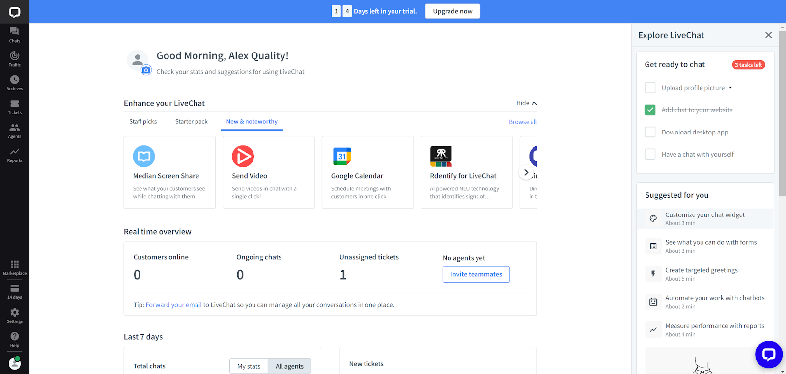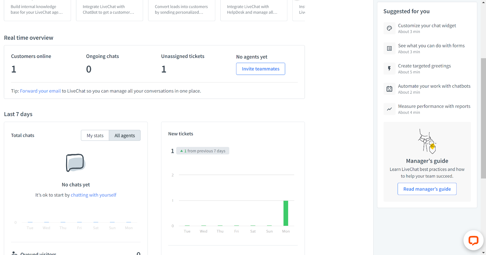 Livechat ir stabils profesionāls risinājums, un tāda ir arī saskarne. Ir viegli iepazīt lielāko daļu rīku, un jūs neapmaldīsieties, pateicoties vienkāršiem ieteikumiem labajā panelī. Kreisajā paneļa izvēlnē varat apskatīt čatus, datplūsmu, pieteikumus, arhīvus, kontaktus un daudz ko citu. Informācijas paneļa centrā ir norādītas dažas uzlabošanas iespējas un ātrs tiešsaistes čata statistikas reāllaika pārskats.