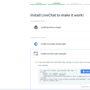 LiveChat reģistrācija norit ļoti ātri. Jums vienkārši ir jāreģistrē savs konts, un reģistrācijas process jūs noved tieši līdz tiešsaistes čata logrīka integrācijas daļai, kas nozīmē, ka jūs varat ieviest savu tiešsaistes čatu praktiski jau no paša sākuma. Tas notiek pārsteidzoši ātri, un LiveChat pat sniedz vairākas integrācijas iespējas. Varat izvēlēties starp WordPress spraudni, Google Tag pārvaldnieku vai manuālu tiešsaistes koda instalēšanu.