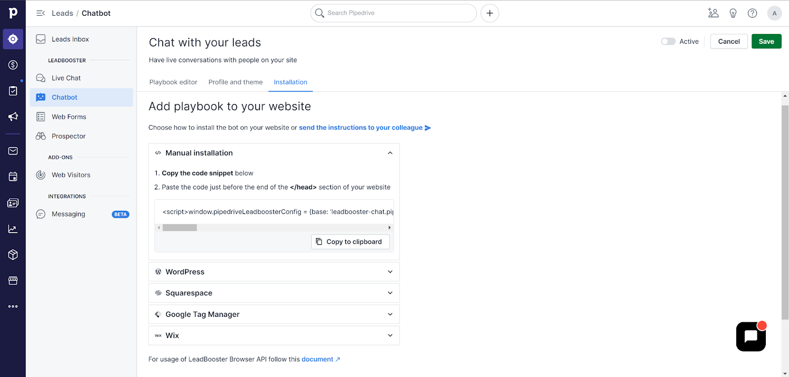 Lai gan es varu teikt, ka PipeDrive plūsmas funkcijas ir ļoti labi izstrādātas, ir žēl, ka programma lielā mērā spiež jums izmantot čatbotu. Mēs aplūkosim PipeDrive čatbotu atsevišķā apskatā, tāpēc patreiz pievērsīsimies PipeDrive tiešsaistes čatam. Tiklīdz esat apmierināts ar savu plūsmas dizainu, varat atlasīt cilni Instalācija un izvēlēties kādu no dažādām iespējām, tai skaitā WordPress, Squarespace, Google Tag Manager, Wix vai manuālo instalāciju. Šī apskata vajadzībām izvēlējos manuālo uzstādīšanu.