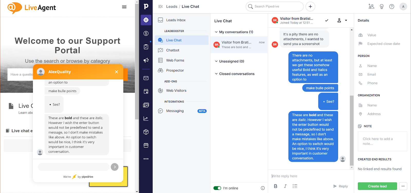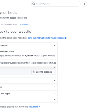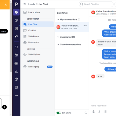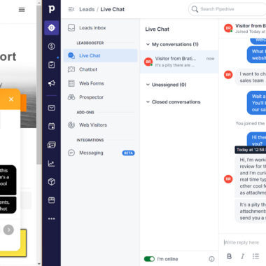 PipeDrive mājaslapā nav tieši norādītas pieejamās tiešsaistes čata funkcijas, izņemot čatbotu un integrāciju ar pārējiem CRM rīkiem, lai iegūtu vairāk potenciālo klientu. Nākamā sadaļa parādīs pieredzi, kas veidojas, strādājot ar PipeDrive tiešsaistes čatu no abām pusēm, un mēs izskatīsim visas pieejamās funkcijas.