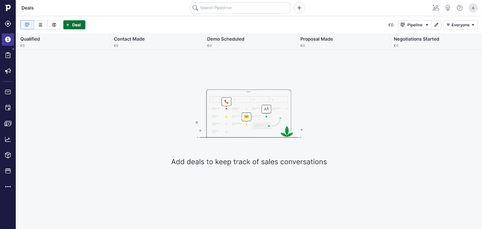 Darba uzsākšana ar PipeDrive notiek ātri, jums priekšā ir tikai īsa reģistrācija. Tiklīdz tā ir pabeigta, varat sākt iepazīties ar informācijas paneli. Pipedrive nav tikai tiešsaistes čata risinājums, tāpēc lietotājiem tiek piedāvātas vairākas iespējas un rīki. Tomēr saskarne izskatās diezgan glīta. Tā ir ļoti labi noslīpēta, nepārblīvēta, un izskatās mērķtiecīga, tāpēc jums nevajadzētu rasties problēmām piekļūt kādai vajadzīgajai funkcijai.