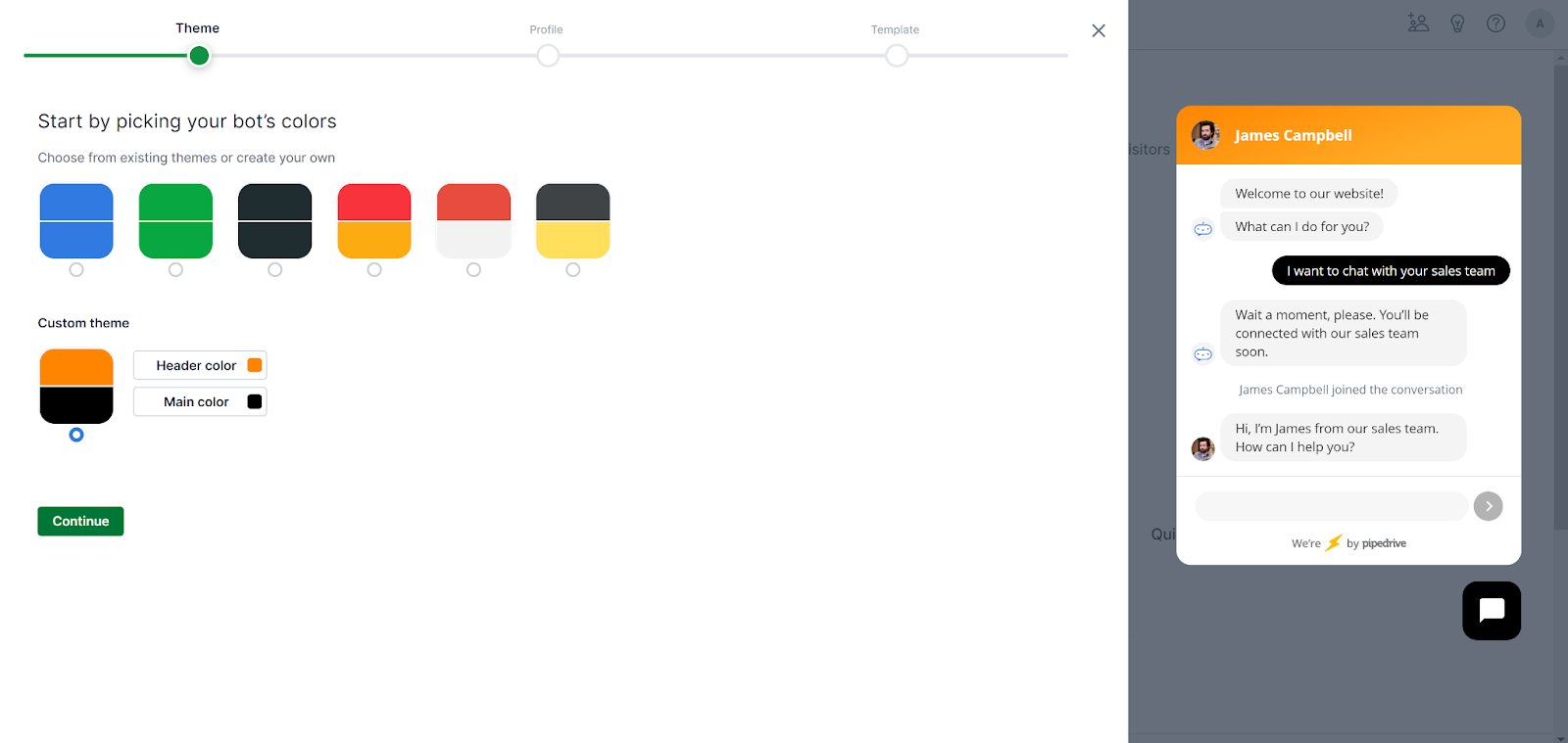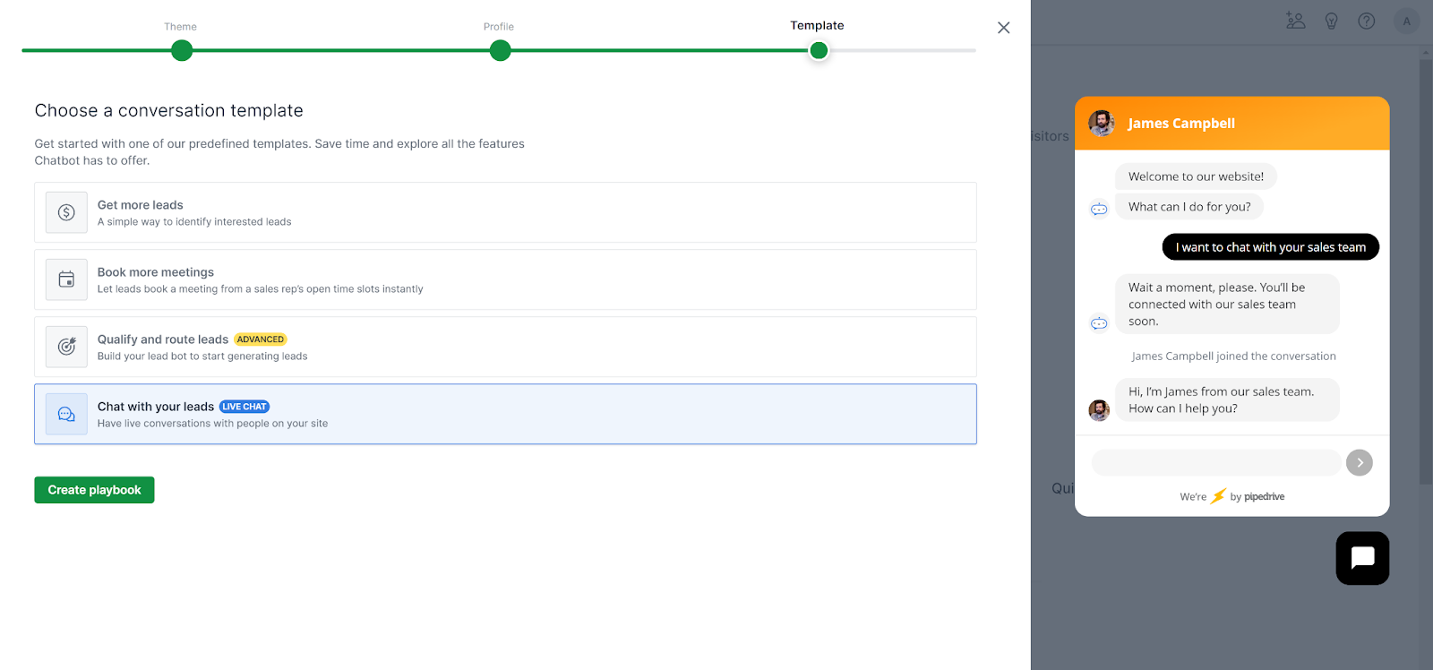 Nākamajā sadaļā PipeDrive obligāti lūgs jums definēt savu čatbotu (pat ja to nevēlaties). Pēc tam nākošajā sadaļā tiek uzdots jautājums par jūsu tiešsaistes čata mērķi, un jūs varat izvēlēties, vai vēlaties piesaistīt vairāk potenciālo klientu, ieplānot vairāk satikšanās vai izvērtēt un pārvirzīt interesentus. Visbeidzot, pastāv iespēja uzsākt sarunas ar klientiem, tāpēc noteikti izvēlieties šo iespēju, ja neesat ieinteresēts izmantot čatbotu.