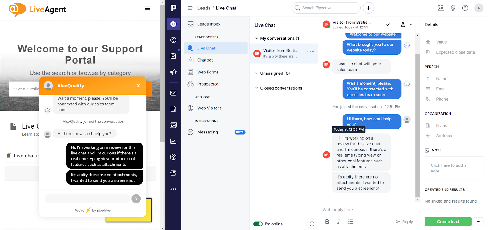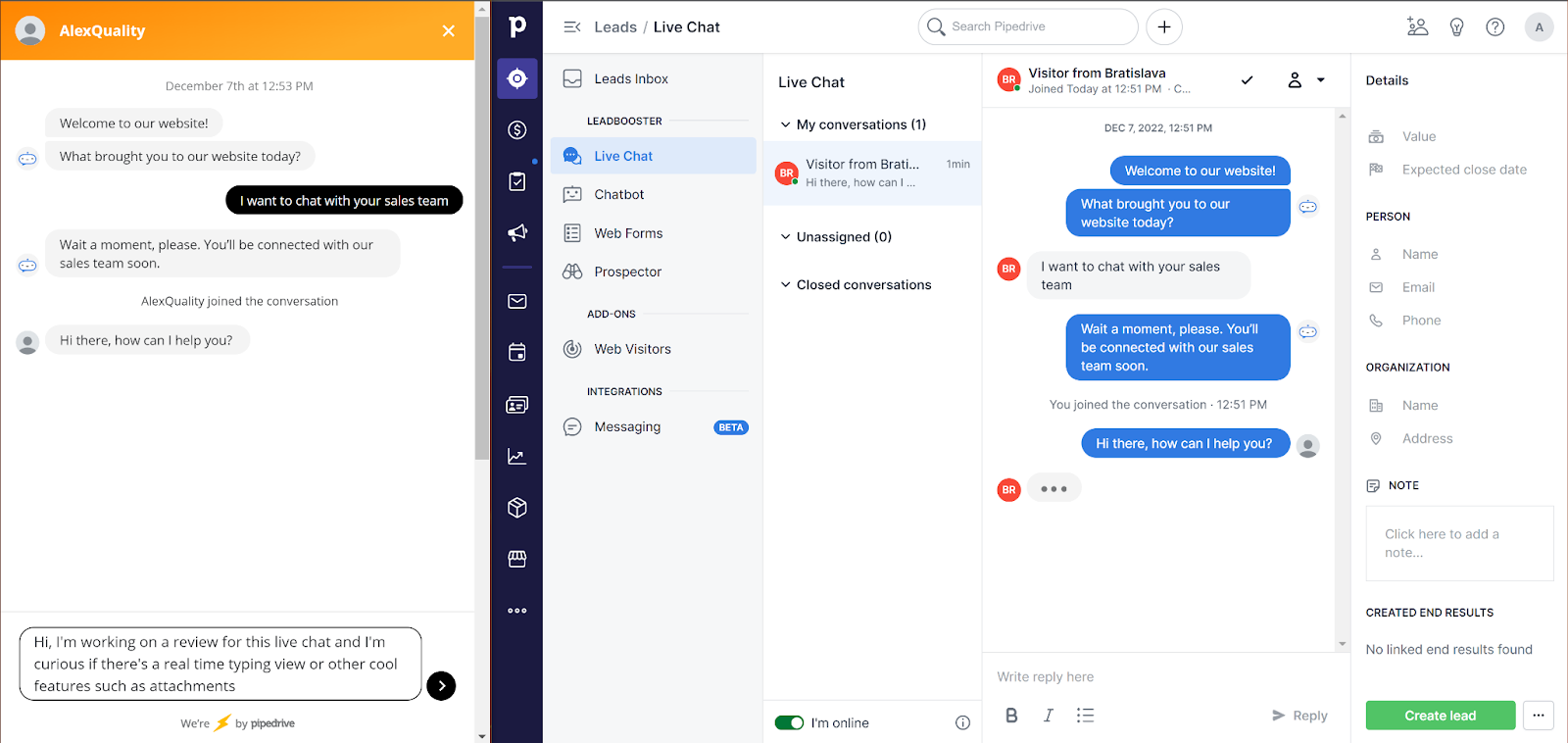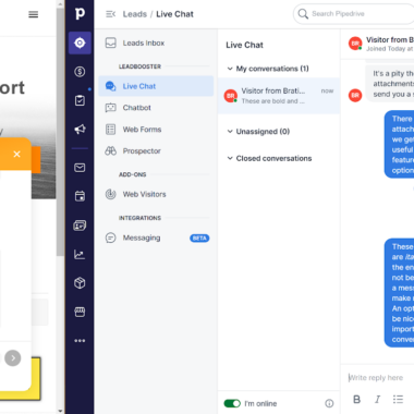 Es sāku rakstīt, lai pārbaudītu, vai PipeDrive tiešsaistes čats atbalsta reāllaika rakstīšanas ieskata funkciju, bet diemžēl nē. Kopumā tiešsaistes čats ir pārāk koncentrēts uz čatbota pieredzi, un nedaudz atstāj novārtā reālā tiešsaistes čata daļu. Pielikumi nav pieejami vispār, tāpēc šī tiešsaiste ir paredzēta tikai rakstiskai saziņai. Tas ir pietiekami lielākajai daļai lietotāju, bet vienmēr ir patīkami, ja pieejami papildu līdzekļi. Bez pielikumiem lietotāji būs spiesti pārslēgties no tiešsaistes čata uz e-pastu vai uz jebkuru citu saziņas kanālu, kas atbalsta pielikumus.