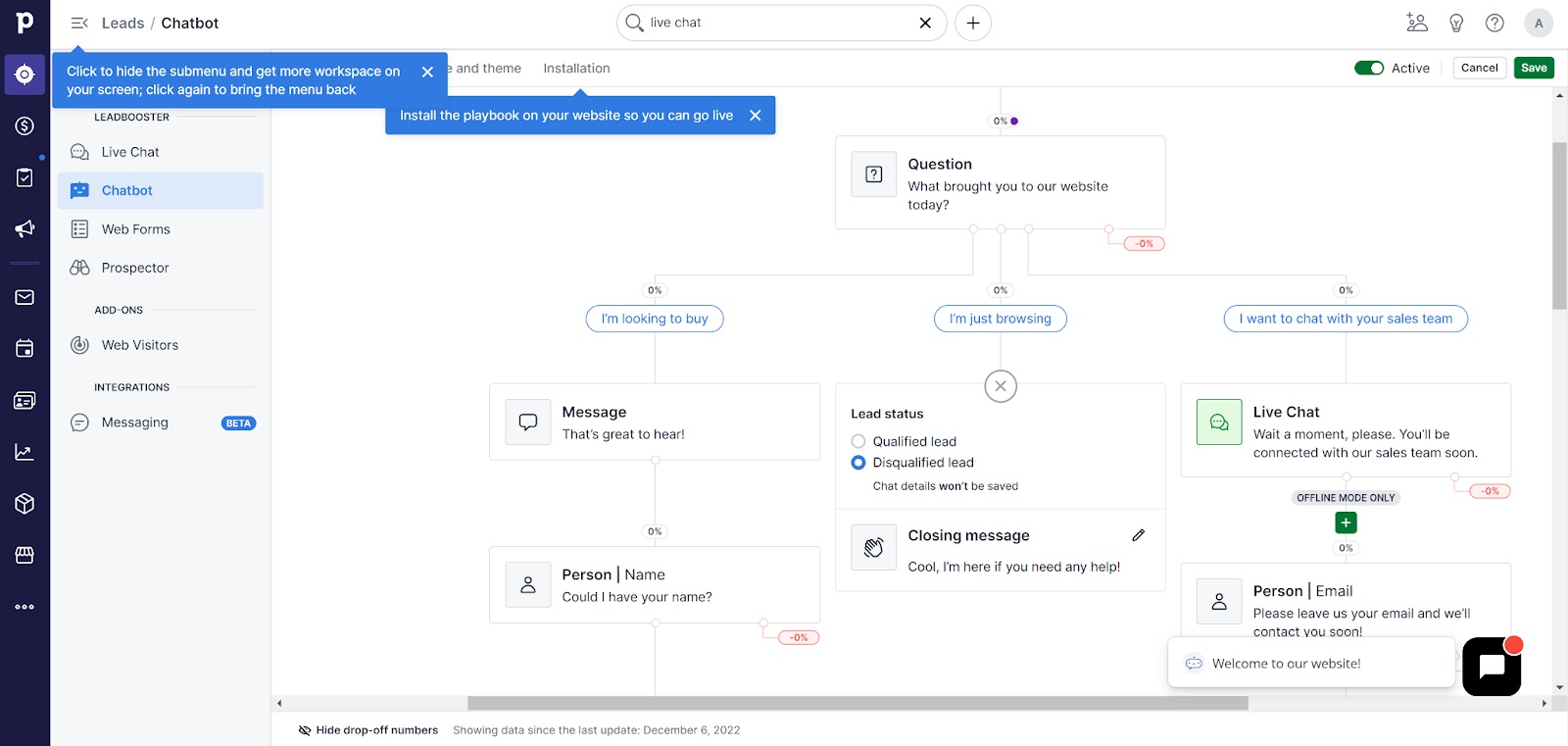 Nav iespējams pilnībā atbrīvoties no čatbota funkcijas, un ir nepieciešams pievienot vismaz pamatplūsmu. Automatizāciju varat samazināt, saglabājot saīsinātu pielāgoto plūsmu un pievienojot tiešsaistes čata iespēju tieši pārvirzīšanas laikā. Varat arī izvēlēties iestatījumu, kas piedāvā minimālu čatbota mijiedarbību.