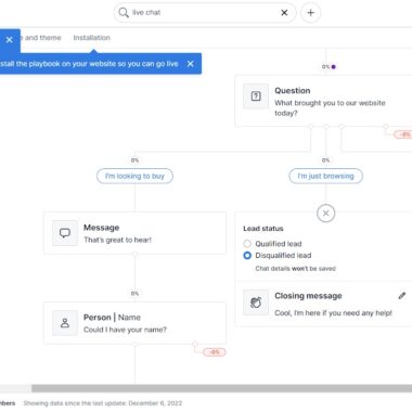 Nākamais ir plūsmas konfigurācija. Tā kā šī ir PipeDrive specialitāte, jūs nevarat izlaist šo procesu – jums jākonfigurē sākotnējā plūsma sistēmā, kas ir līdzīga IVR pārvirzīšanai. Jūs iegūsit vizuālu informāciju par iespējām un darbībām, ko varat automatizēt savā tiešsaistes čatā. Par laimi, ja nolemsit saglabāt izmaiņas, neko nekonfigurējot, viss būs kārtībā, jo PipeDrive uzreiz piedāvā iepriekš definētu čata plūsmu. Tomēr joprojām pastāv zināma automatizācija, un to nevar izslēgt. Tas attiecas tikai uz sarunām.